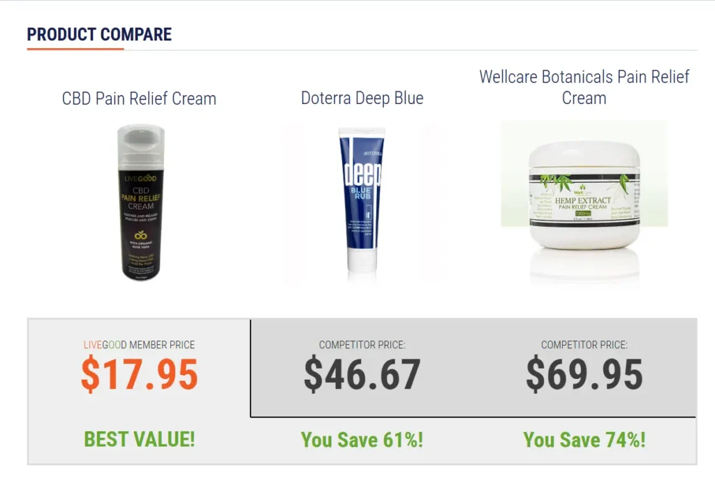 | LiveGood CBD Pain Relief Cream | $17.95 | ✅ CBD + CBG | 4 oz | $4.49 |